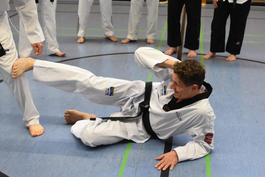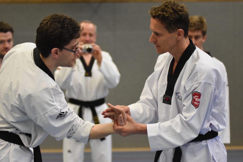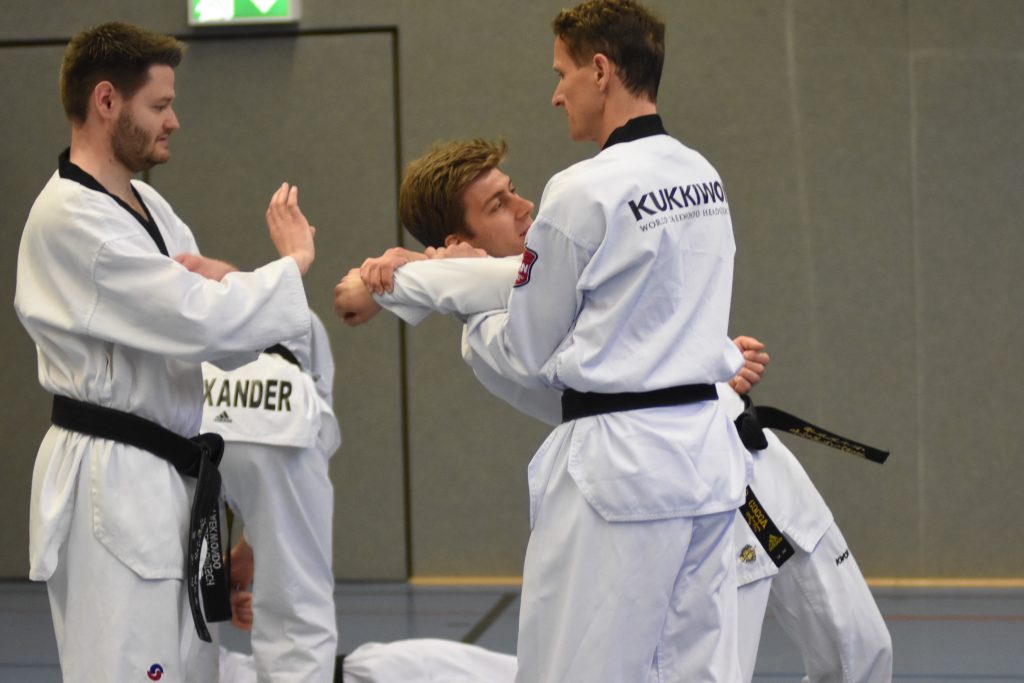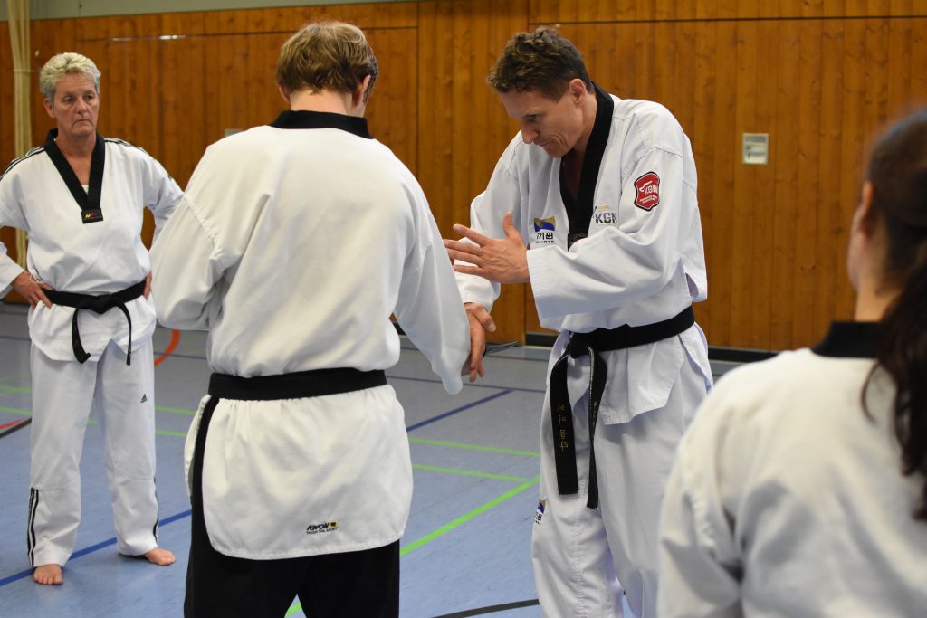 Während des gesamten Lehrgangs profitierten die Teilnehmenden enorm von Kai Müllers jahrzehntelanger Erfahrungen als aktiver Kampfsportler und als Trainer. Neben dem 8. Dan im Taekwondo hat er den 4. Dan im Ju Jutsu und den 2. Dan im Karate. Diese Bandbreite ist genau das, was für Taekwondo-Sportler den Blick über den Tellerrand ermöglicht und blinde Flecken im eigenen Training aufdeckt. Denn Selbstverteidigung ist und bleibt ein wichtiger Bestandteil eines jeden Kampfsports, ja sie ist dessen Ursprung – auch wenn wir das im Taekwondo manchmal zu vergessen scheinen.