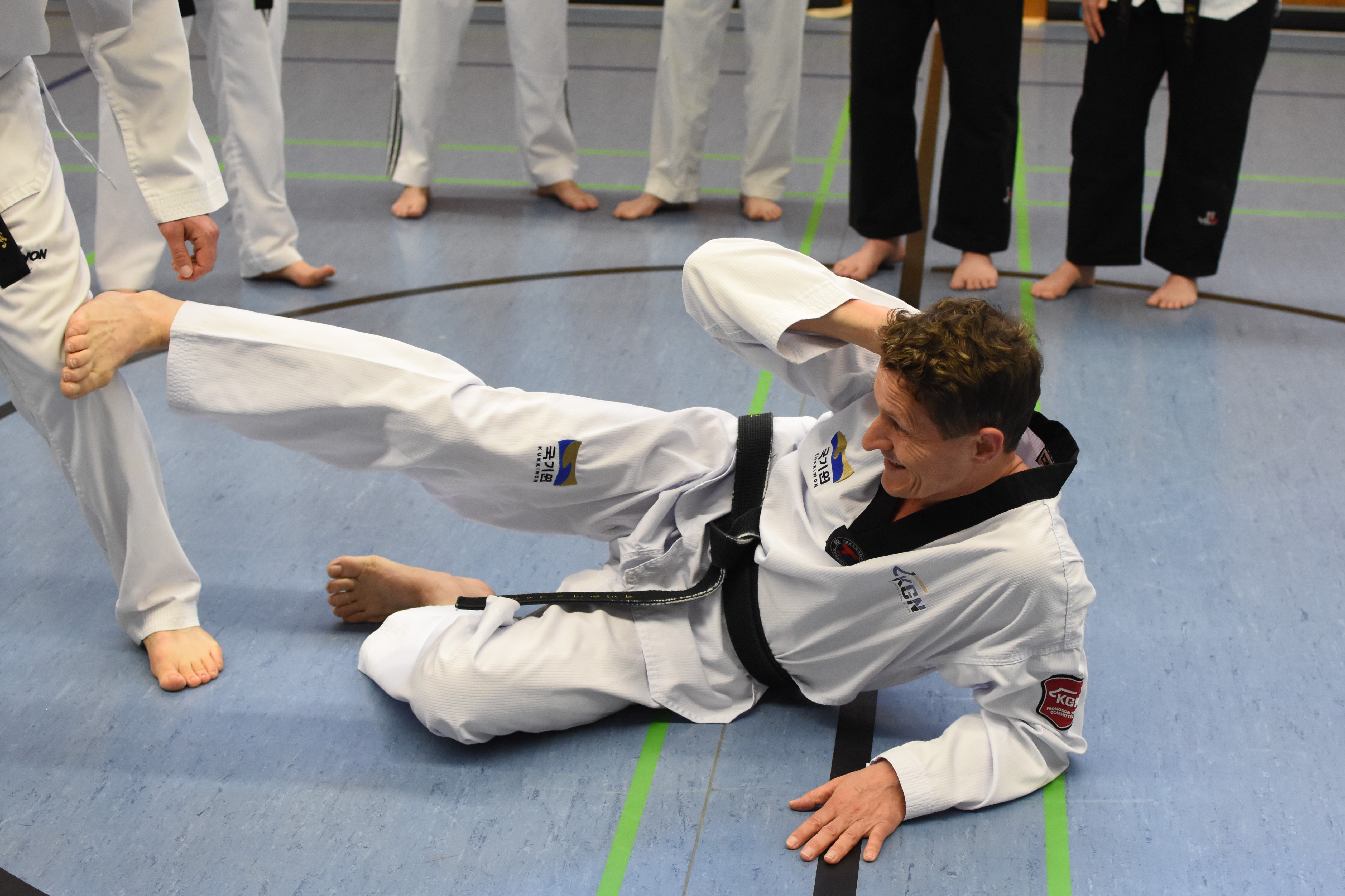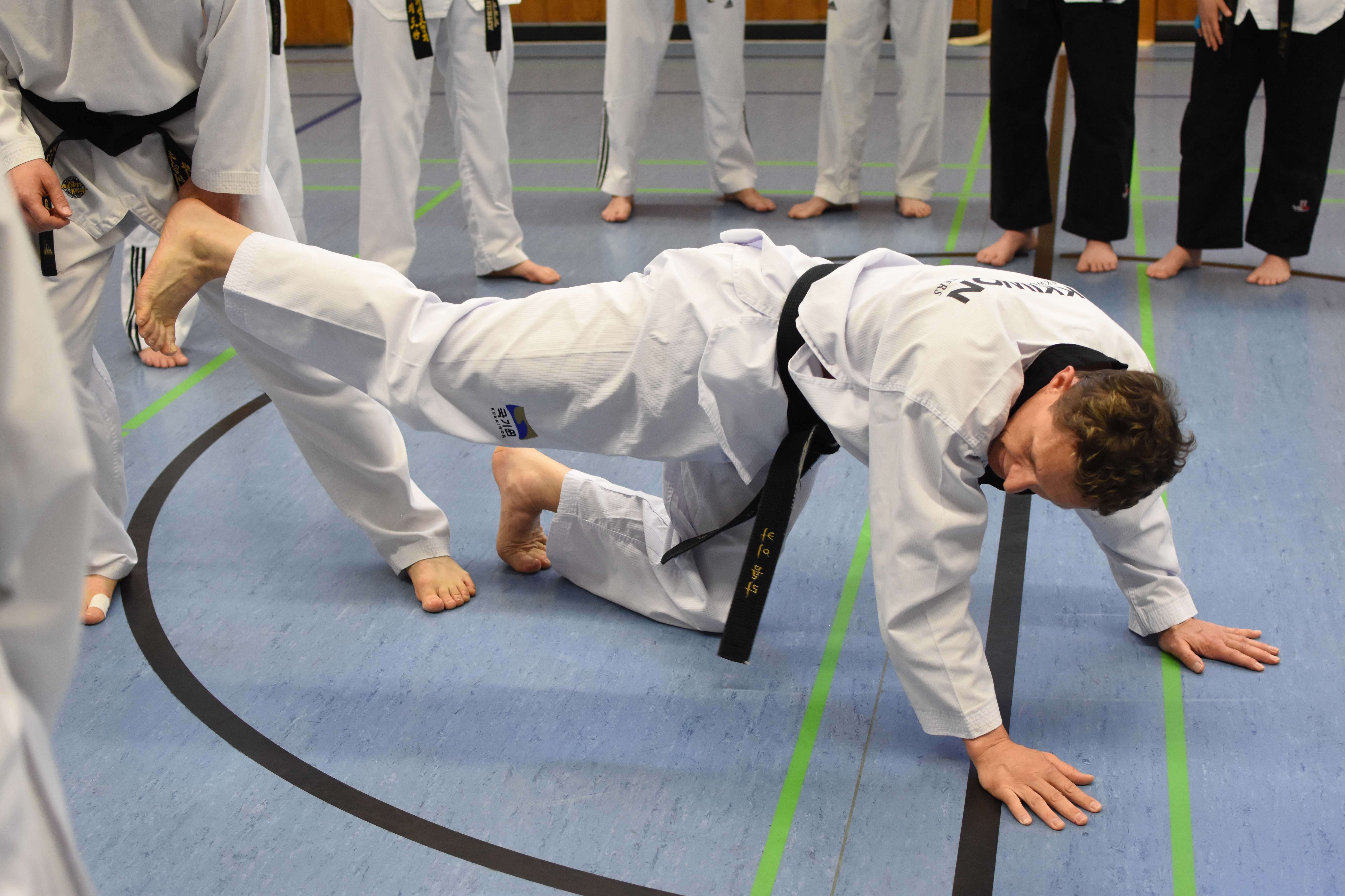 Mit diesem Realitätssinn und seiner offenen Art wusste Kai die Gruppe, die sich an dem sonnigen Frühlingswochenende in der Halle der Realschule am Klostergarten eingefunden hatte, schnell zu begeistern. So fragte er gleich zu Anfang, welche Wünsche und Vorstellungen die Teilnehmenden hätten, die überwiegend Taekwondo-Schwarzgurte waren und teils auch bereits Erfahrungen aus anderen Kampfkünsten wie dem Hapkido mitbrachten. Damit war das Niveau der Veranstaltung durchweg hoch.