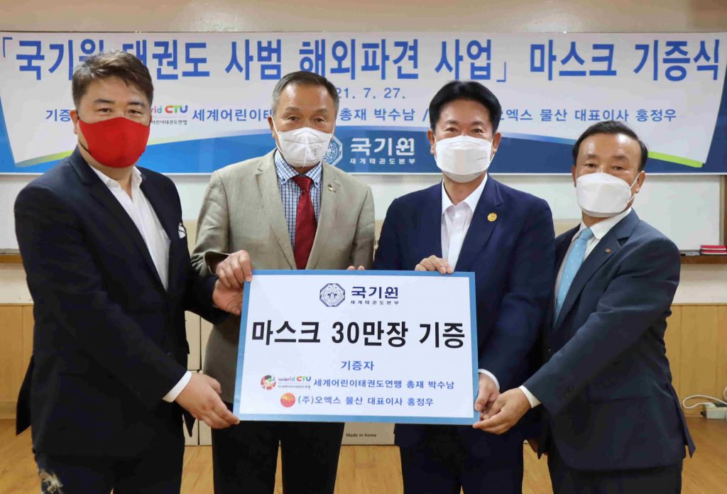The World Children Taekwondo Union, in cooperation with OX C&T, donated 300,000 high-quality medical masks to Kukkiwon, which are jointly produced by OX C&T and JM Cosmetics using the latest cutting-edge technology and exported overseas.